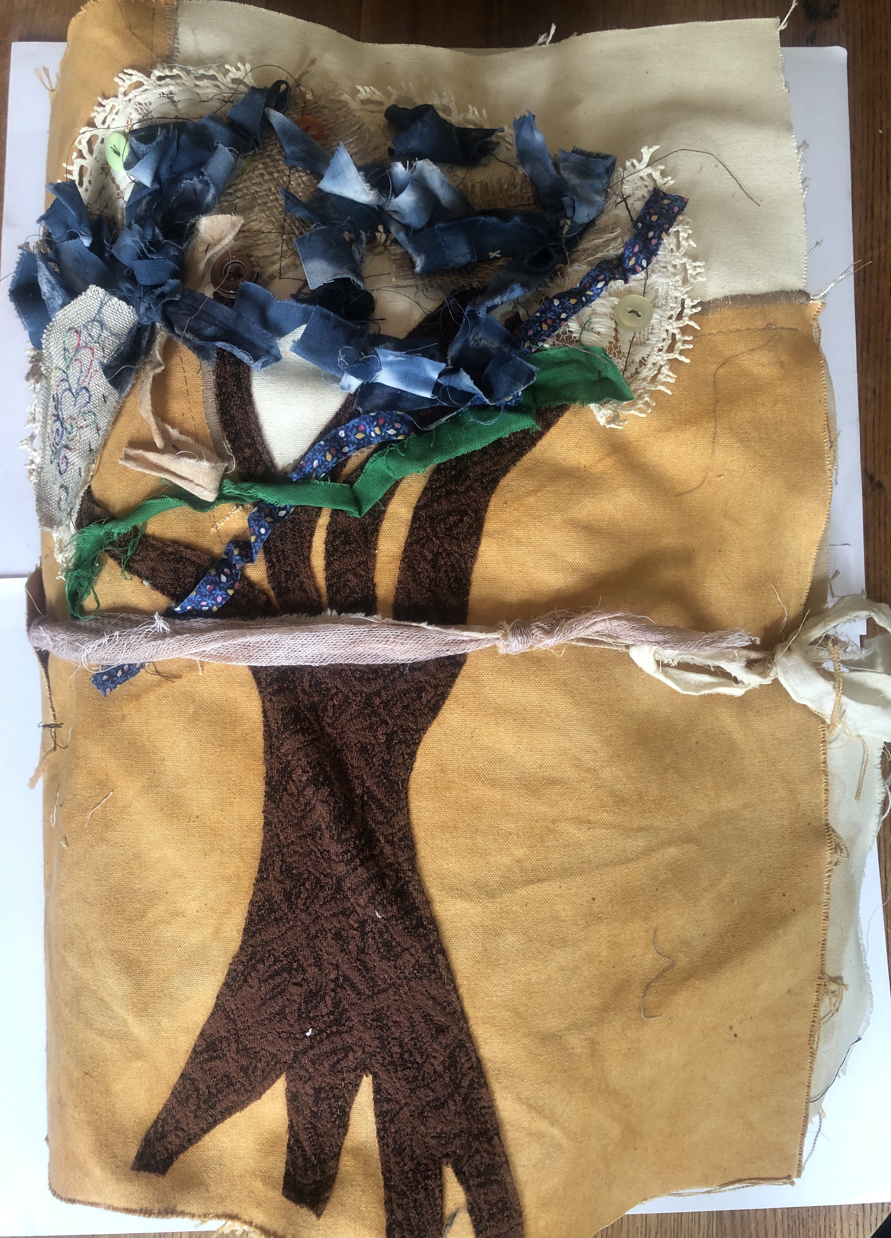 So here is the full sketchbook when closed, it fastens with a cheesecloth rope which has been dyed with beetroot juice and it is a very heavy piece. I made the covers and most of the sections from calico which has been dyed with natural dyes, my favourite colour being the rust dye as it is bold and distressed looking. I did an applique tree on the front using fabric scraps to add interest.