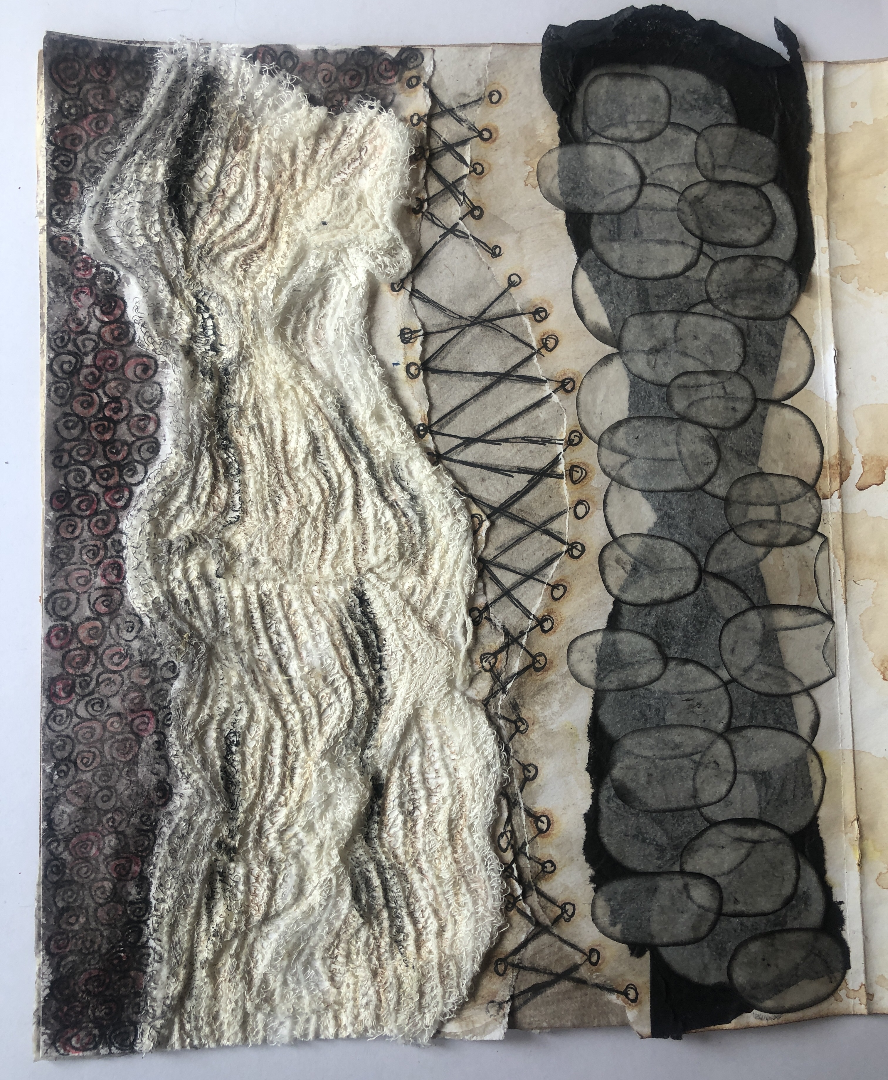 I began with some initial sketches using black pen and mixed media as I wanted to incorporate as much as possible to reflect some of the themes of Noda’s work. I made a tea dyed small A4 booklet and the front was made from old music sheets, some burnt Luratex fabric and cut out pieces of silver paper.