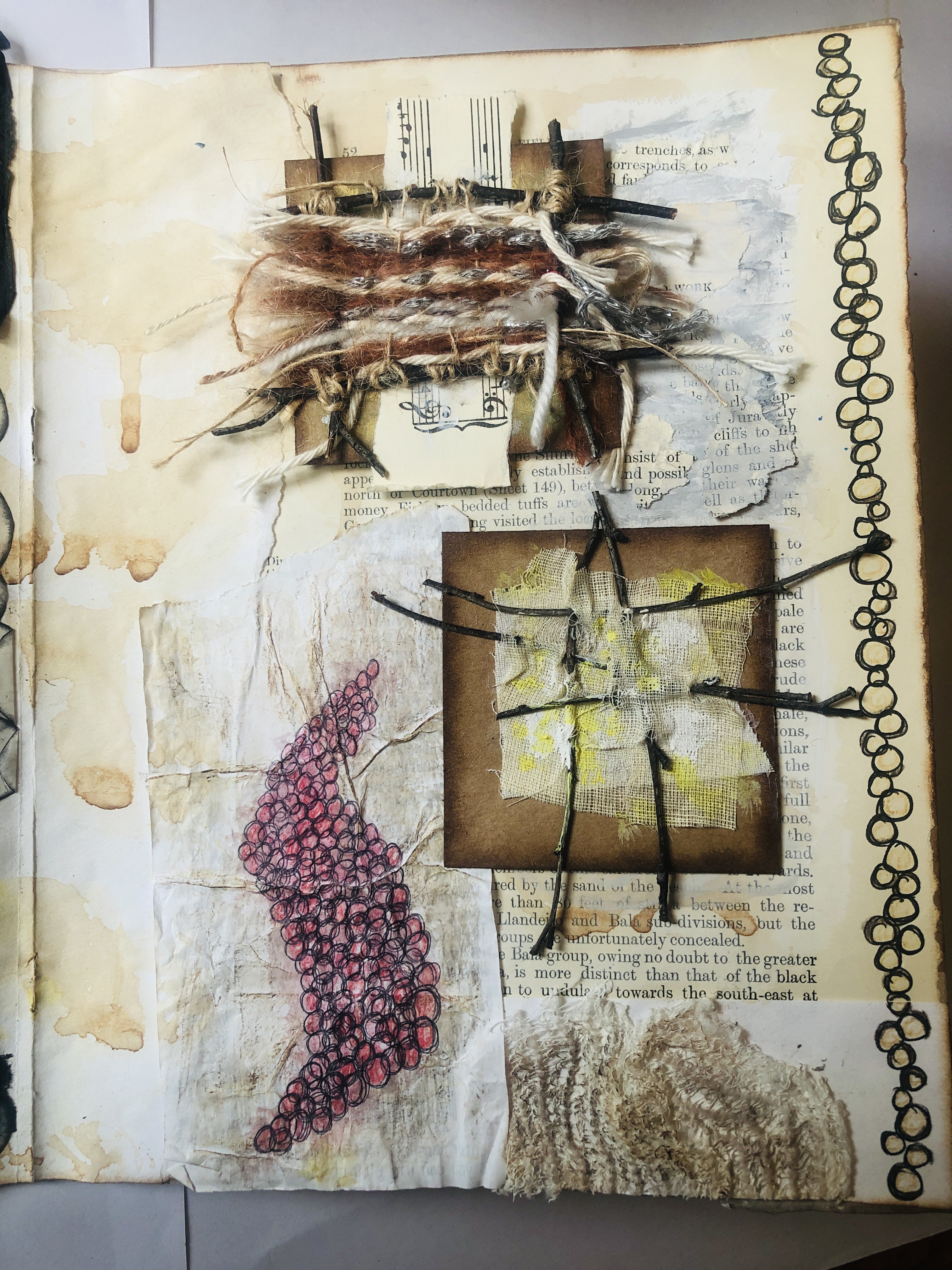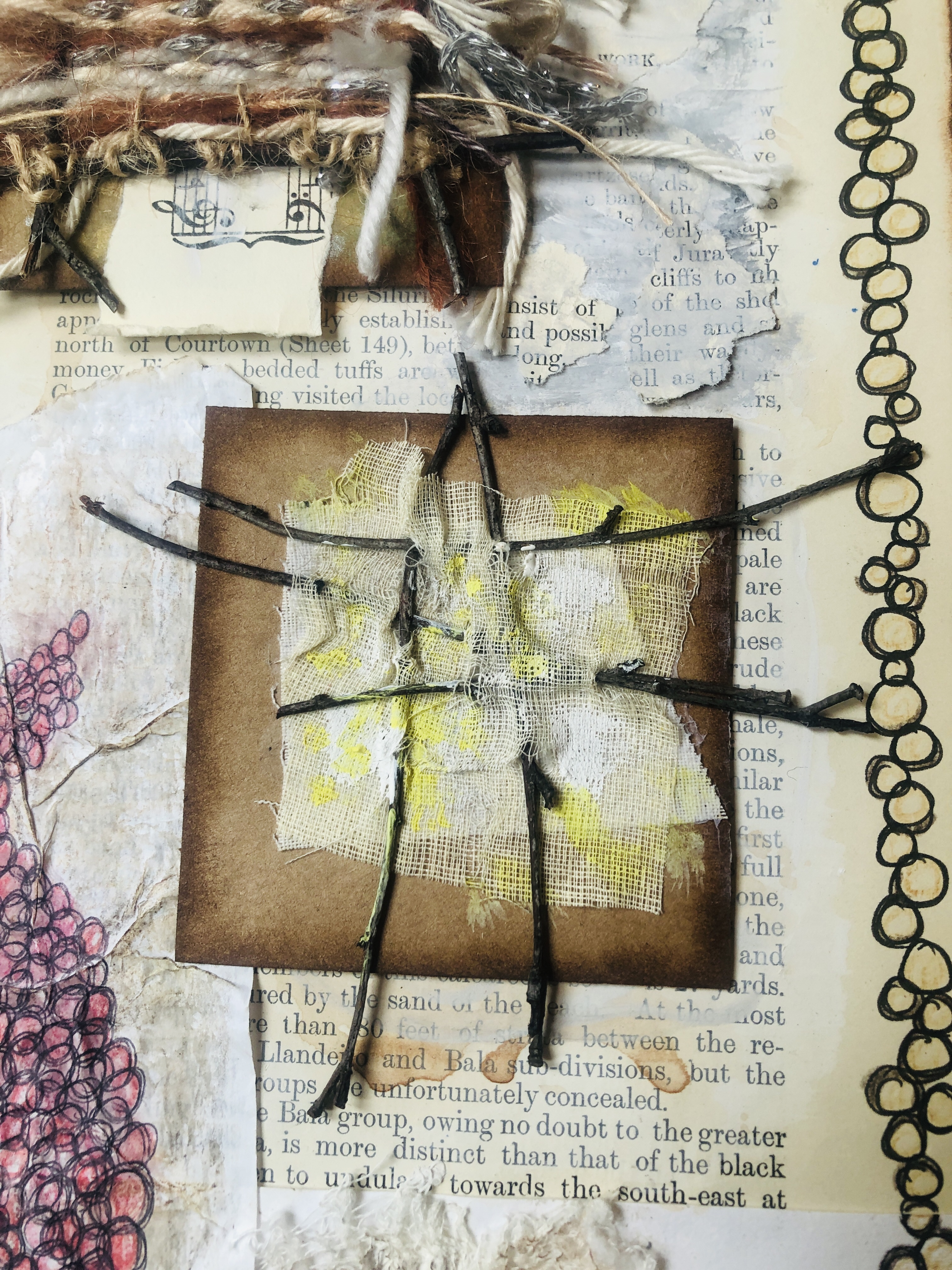 Inside this I drew with black pen and coloured pencils and used a section of old bandage, torn paper and cut out circles of parchment paper to create images to interpret Noda’s knitted pieces on the left hand page and on the right hand page I made a collage of distressed paper with small drawings stuck on and also two raised squares. The mounted squares comprised of a small knitting loom made from twigs with yarn threaded through it and with the second square I had pierced a small section of thin calico with twigs to create a three dimensional weaving loom to which I added yellow paint to add interest.
