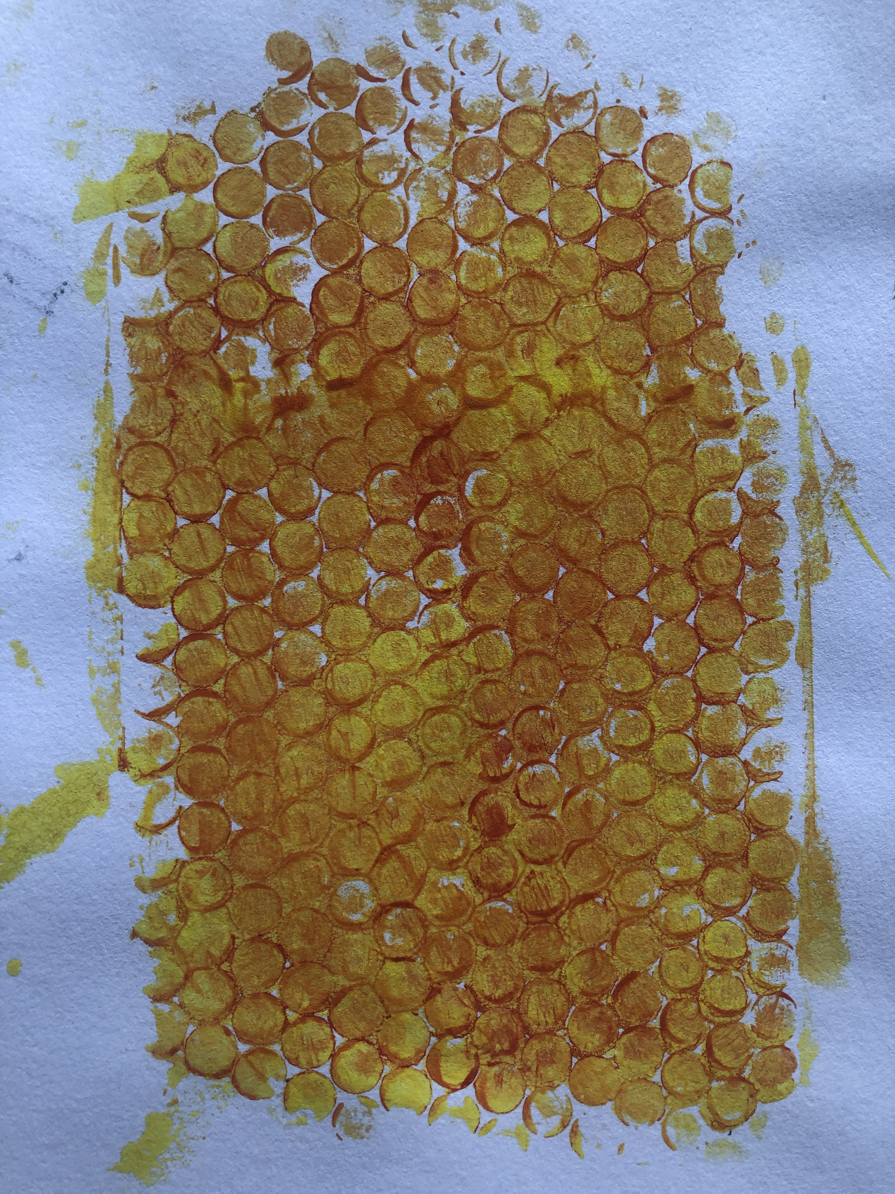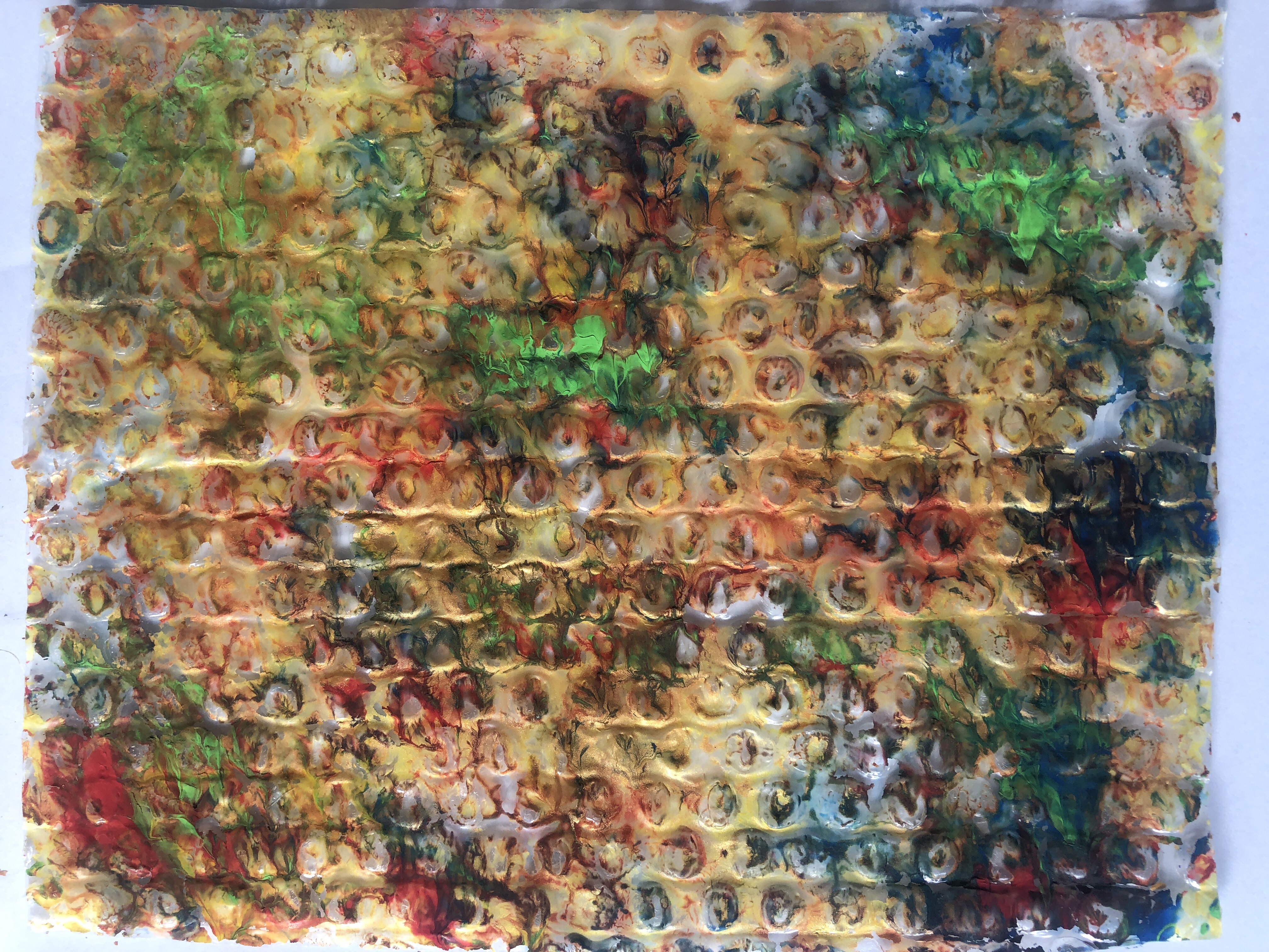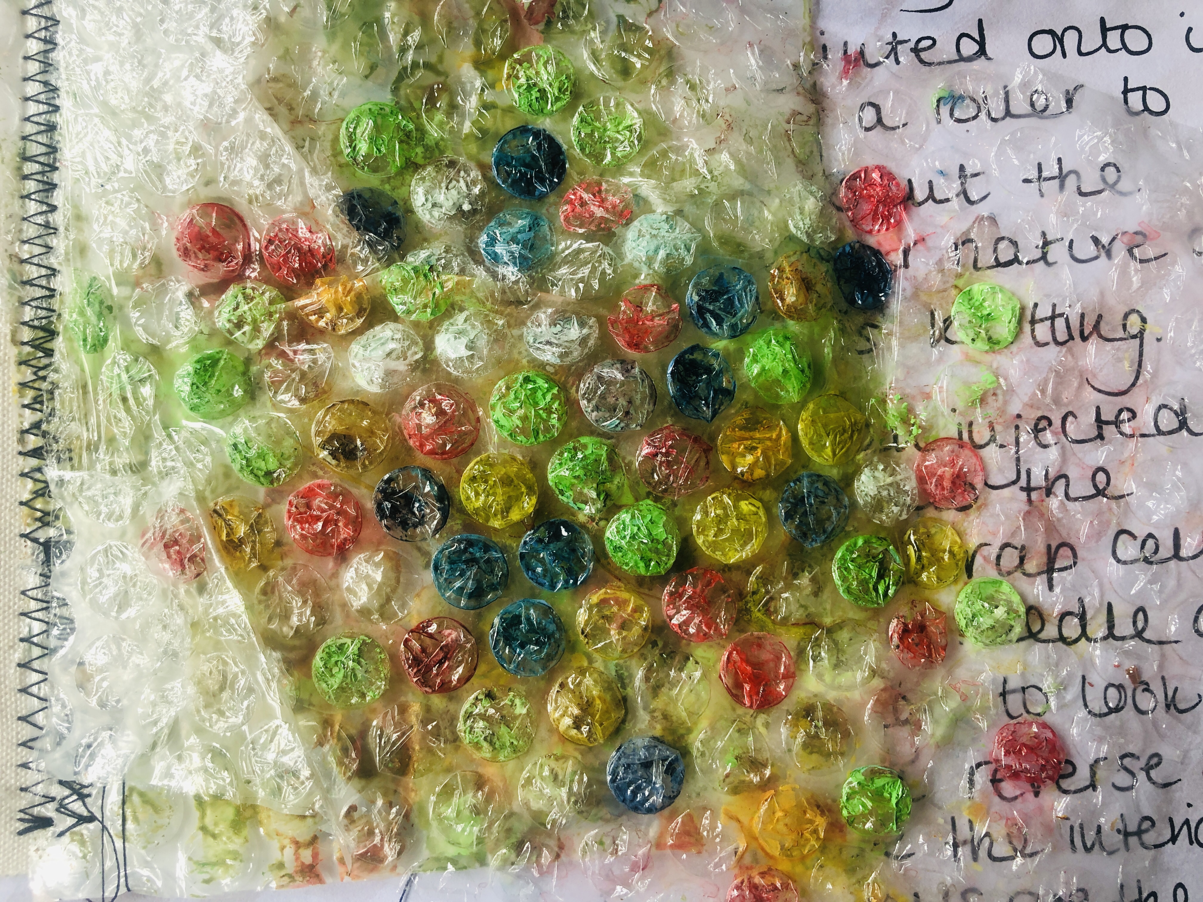 I moved onto bubblewrap as I planned to use this in my Gelli plate printing and painted onto a section of bubblewrap from a padded envelope and was interested on how the colours showed up the pattern. I also obtained a hypodermic needle from my local vets practice and injected thinned paint into the bubbles on the more flexible wrap and I really liked this effect although it was very fiddly to do.