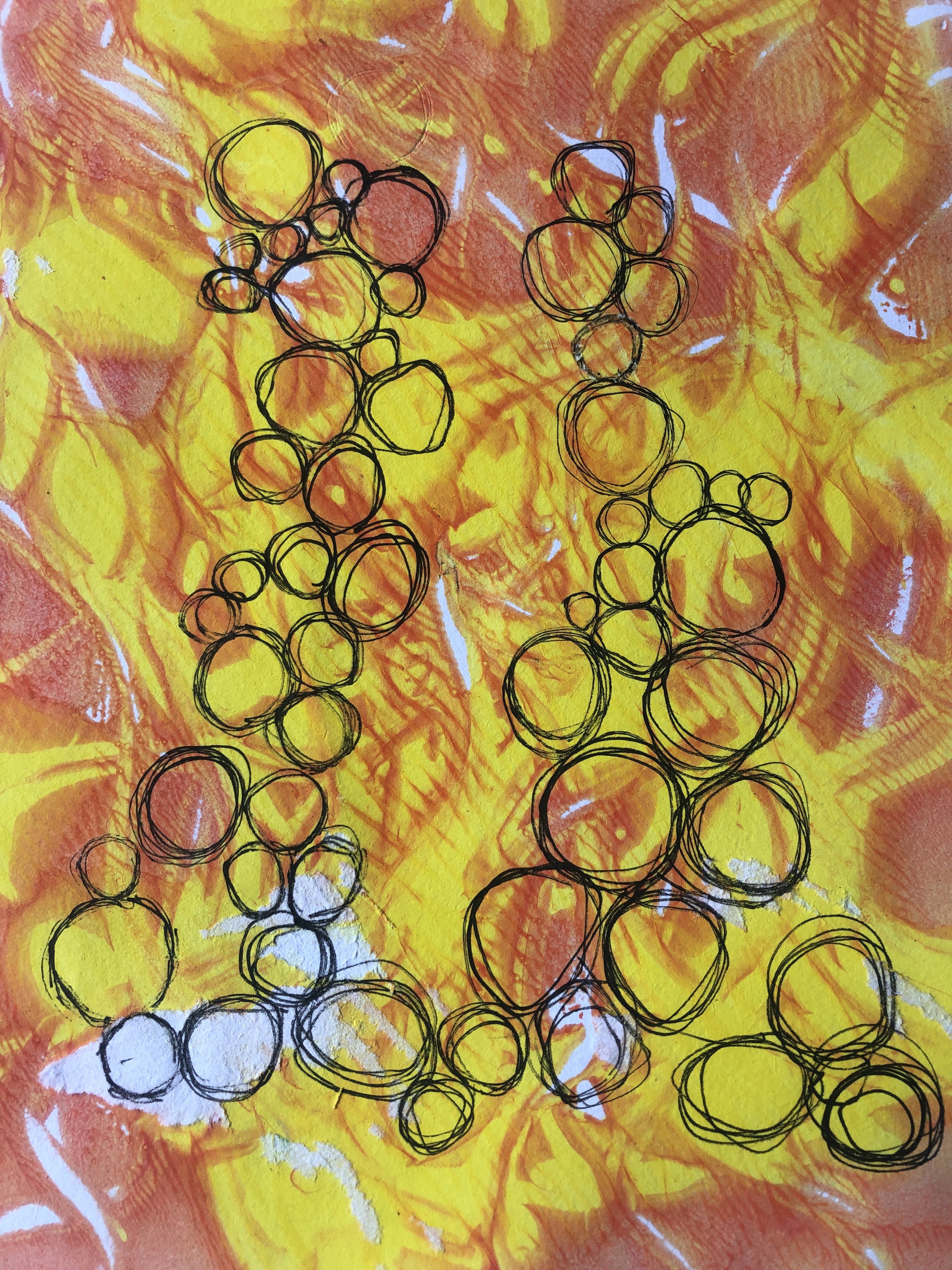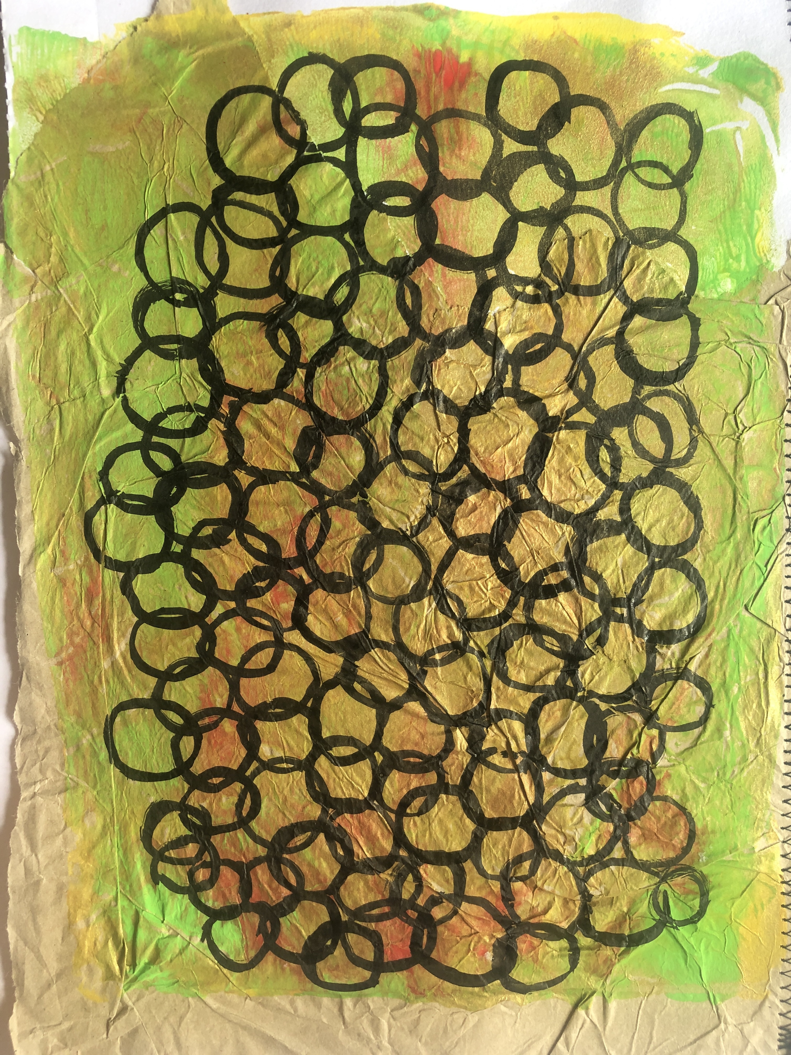 I then drew circles using a brush and black ink and used a cork to stamp different colours of paint onto a piece of card and I wanted the colours to semi blend together to create a more structured look, I used some gold paint too and the reflection of this was highlighting areas of the piece. On another piece of paper adapted with some brown packing paper and a book page I drew loops and added drips of gold paint which worked well when I had added chalk pastel inside the loops.