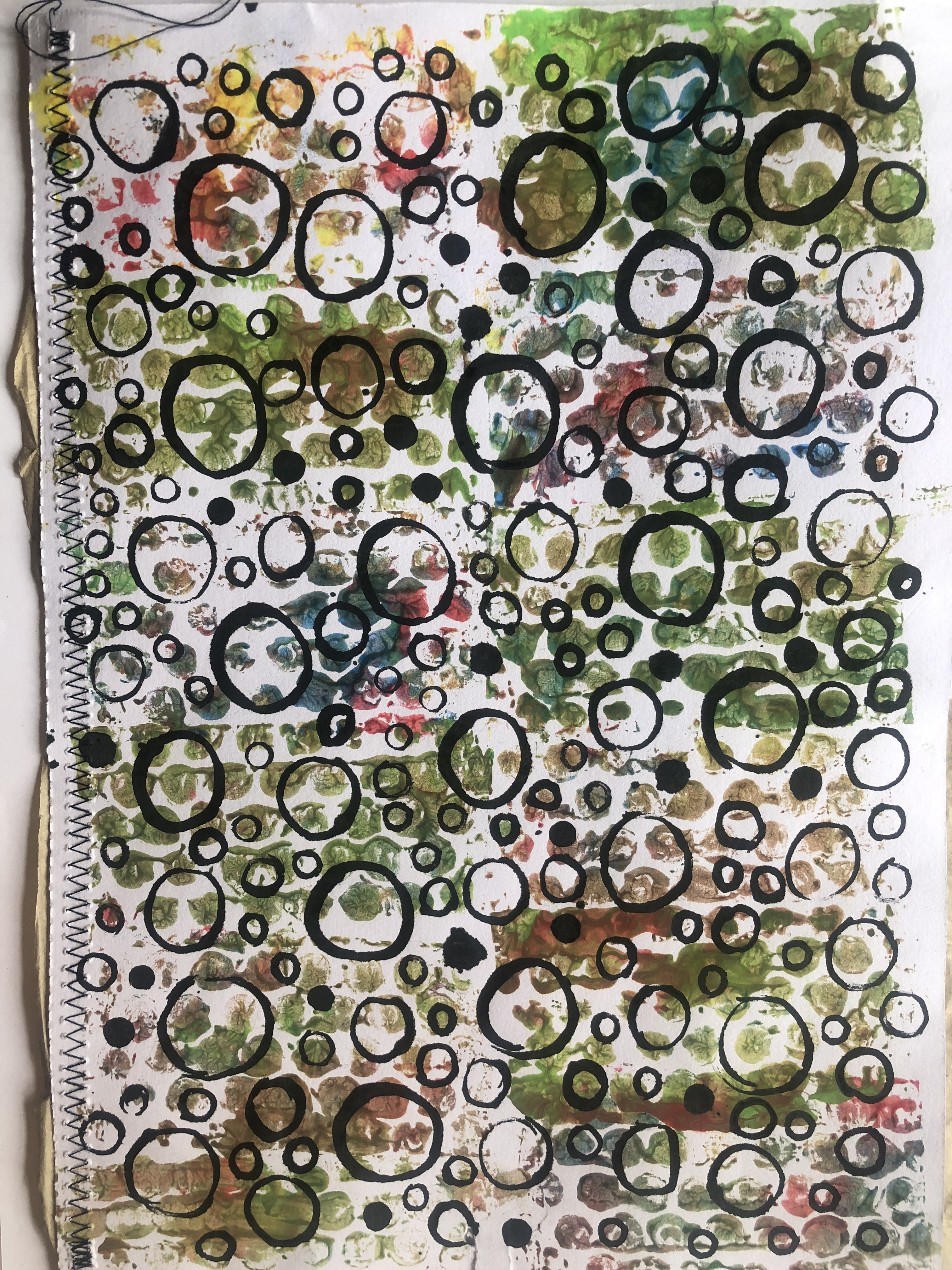 I moved onto a new page and this time painted a background onto brown packing paper and then drew a lattice work of circles over the top, I felt this was more successful than some of my other sketches as it looked bolder. Then I rollered a mix of colours over bubblewrap and used it to print onto a new sheet of paper and drew circles over it. I liked this one better as it looked more like Noda’s jumper.