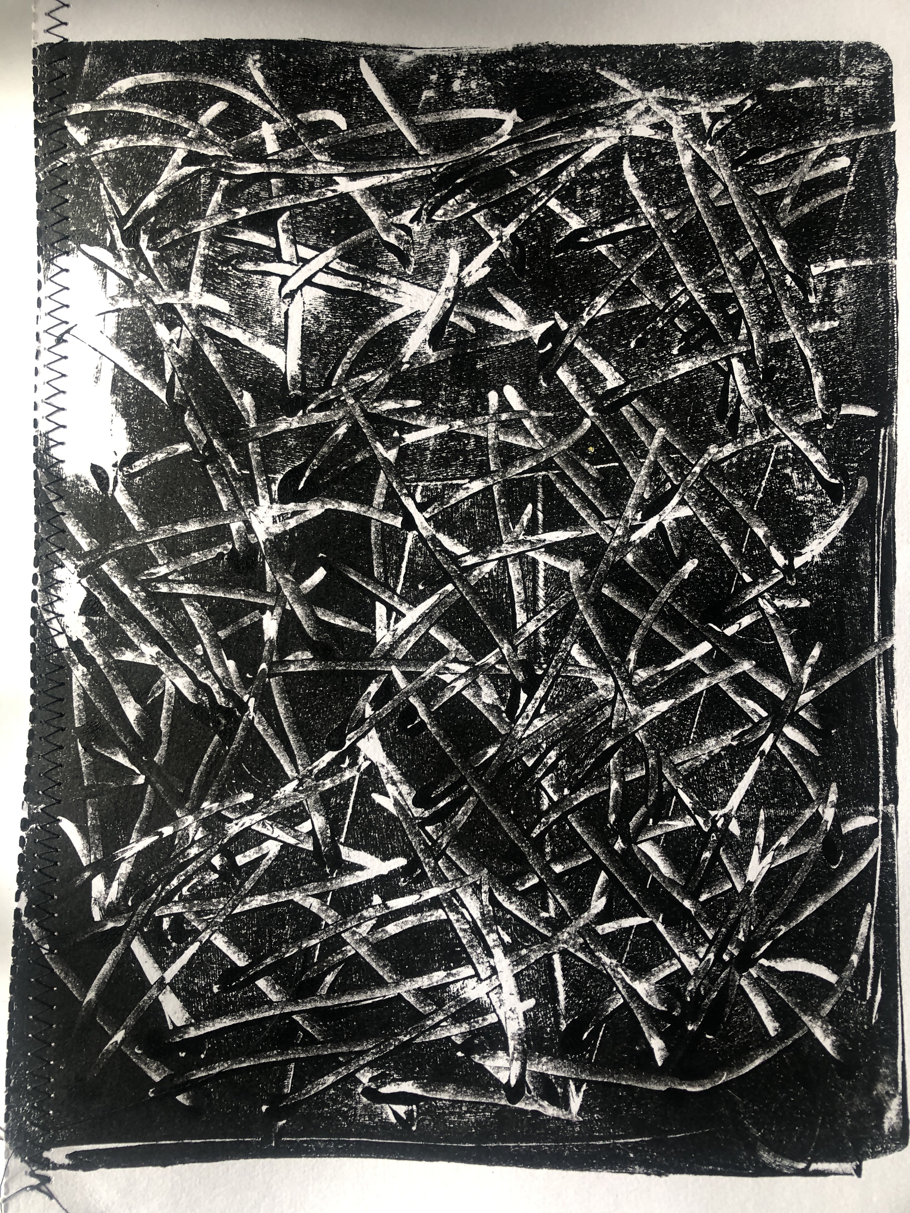 The painting on the left I found to be my particular favourite as it seemed to me to be about negative mark making, almost like a scraperfoil piece. I couldn’t quite decide if it was white paint on black paper or the other way around but it gave me a flood of ideas for work that I wanted to try out in monochrome.